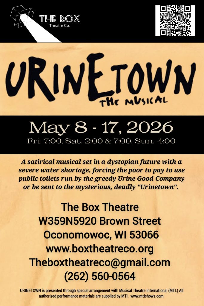 Urinetown The Musical Click here to purchase tickets for Urinetown The Musical! Urinetown is a satirical musical set in a dystopian future where a severe water shortage has led to the privatization of public toilets. The story follows Bobby Strong, a poor citizen who leads a rebellion against the oppressive corporation “Urine Good Company” (UGC), which controls the public toilets and charges citizens to use them. As the plot unfolds, Bobby falls in love with Hope Cladwell, the daughter of UGC’s corrupt CEO, and together they navigate the challenges of love, rebellion, and the harsh realities of their society. The musical explores themes of social injustice, corporate greed, and the fight for basic human rights. 2026 Season Announcement! Help Us Continue to Provide Youth Theatre Opportunities in Southeastern Wisconsin! Our sponsors are local companies and organizations that take great pride in serving southern Wisconsin. They share a common goal with The Box Theatre — to contribute to the area and improve the quality of life for its residents. We depend on the generous support of those who believe in the arts in the lake country area. Your financial support helps us fulfill our commitment to entertain the community, cultivate students, and build memories that will last a lifetime. Donations of any amount are used for unbudgeted expenses, capital improvements, and the continued growth of the Box Theatre. As a Box Theatre sponsor, your company will be linked with one of Lake Country’s most vibrant cultural resources and you’ll receive valuable marketing benefits. Contact Managing Artistic Director, Allison Chicorel, at (262) 560-0564 or via email at theboxtheatreco@gmail.com and get your company in the spotlight this season! Please note: The theatre phone is generally not manned. However, calls are returned within 48 hours, so please leave a message! Legacy Tile Program Show your support of The Box to anyone attending the theatre by purchasing a stone tile to be hung in our lobby! Download the form here and send it by email or mail (W359 N5920 Brown Street, Suite 101 Oconomowoc, WI 53066) with payment to The Box Theatre Company before the final tile is sold. Business Advertising One Show – Ad Space $140/show – Full Page$100/show – Half Page$60/show – Quarter Page Two or More Shows – Ad Space (Bundle and Save) $140/show for the first full page$100/show for each additional half page $100/show for the first half page$70/show for each additional half page $60 /show for the first quarter page$40/show for each additional quarter page Actor Level) $500-quarter page, full color ad in 1 playbill-3 complimentary ticketsStage Manager Level) $1,000-half page, full color ad in 1 playbill-5 complimentary tickets-special shoutout on social media pagesDirector Level) $2000-full page, full color ad in 1 playbill-6 complimentary tickets-tile in the lobby with your logo or name-special shoutout on social media pages-special shoutout in curtain speechProducer Level) $3000-full page, full color ad in 2 playbills-8 complimentary tickets-tile in the lobby with your logo or name-special shoutout on social media pages-special shoutout in curtain speech-company LOGO on the show poster & front of playbillUltimate Triple Threat Level) $3500+-full page, full color ad in 2 playbills-tile in the lobby with your logo or name-special shoutout on social media pages-special shoutout in curtain speech-company LOGO on the show poster & front of playbill-10 complimentary tickets OR private performance for a group up 45 if sponsorship is secured 4 months prior to opening night.**** We will happily tailor a package specifically to fit your requests! None of these arrangements are set in stone, if you’d like to mix and match some perks we would love to discuss options and work out a custom package for you!!
